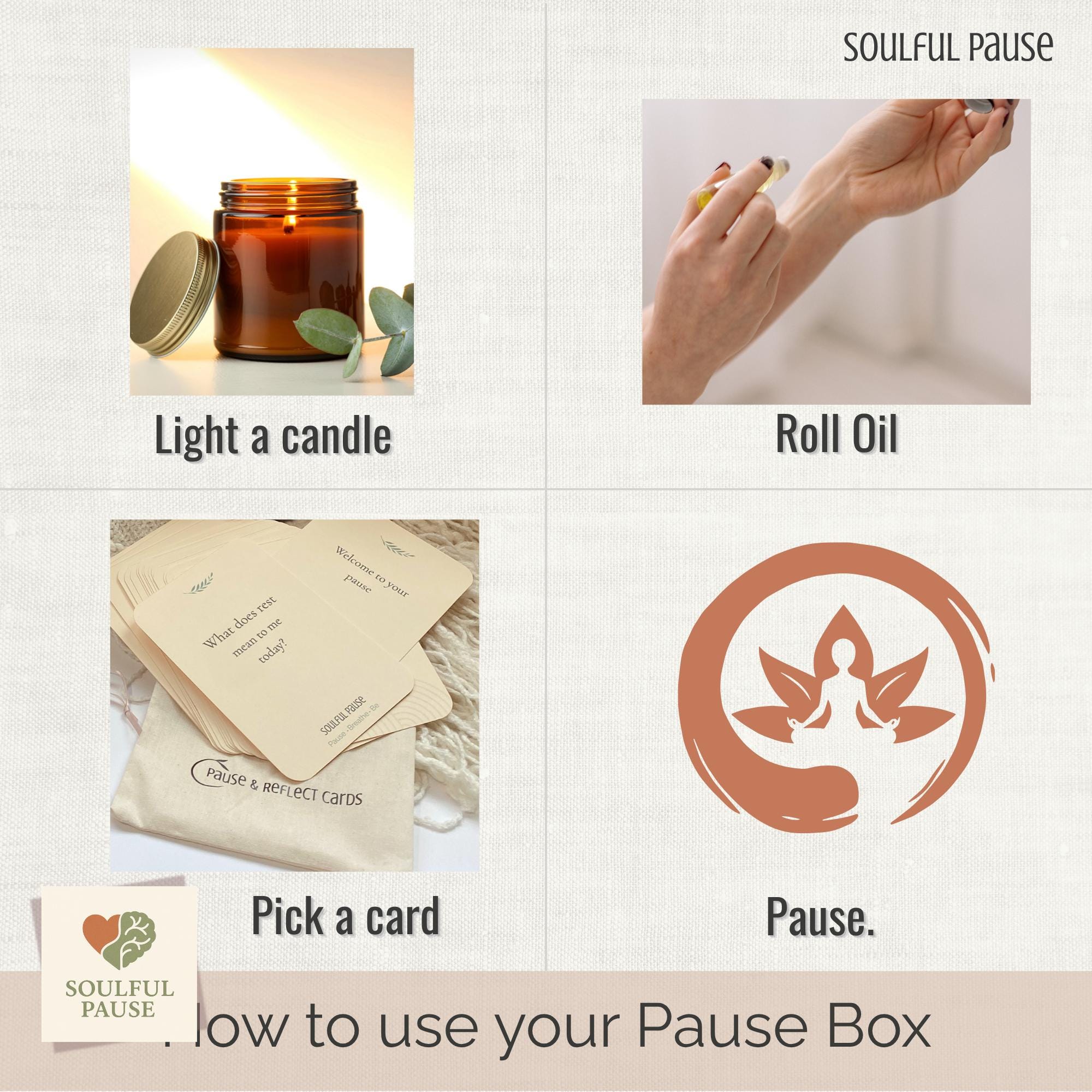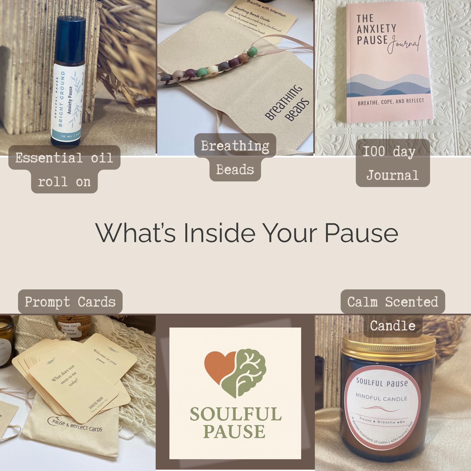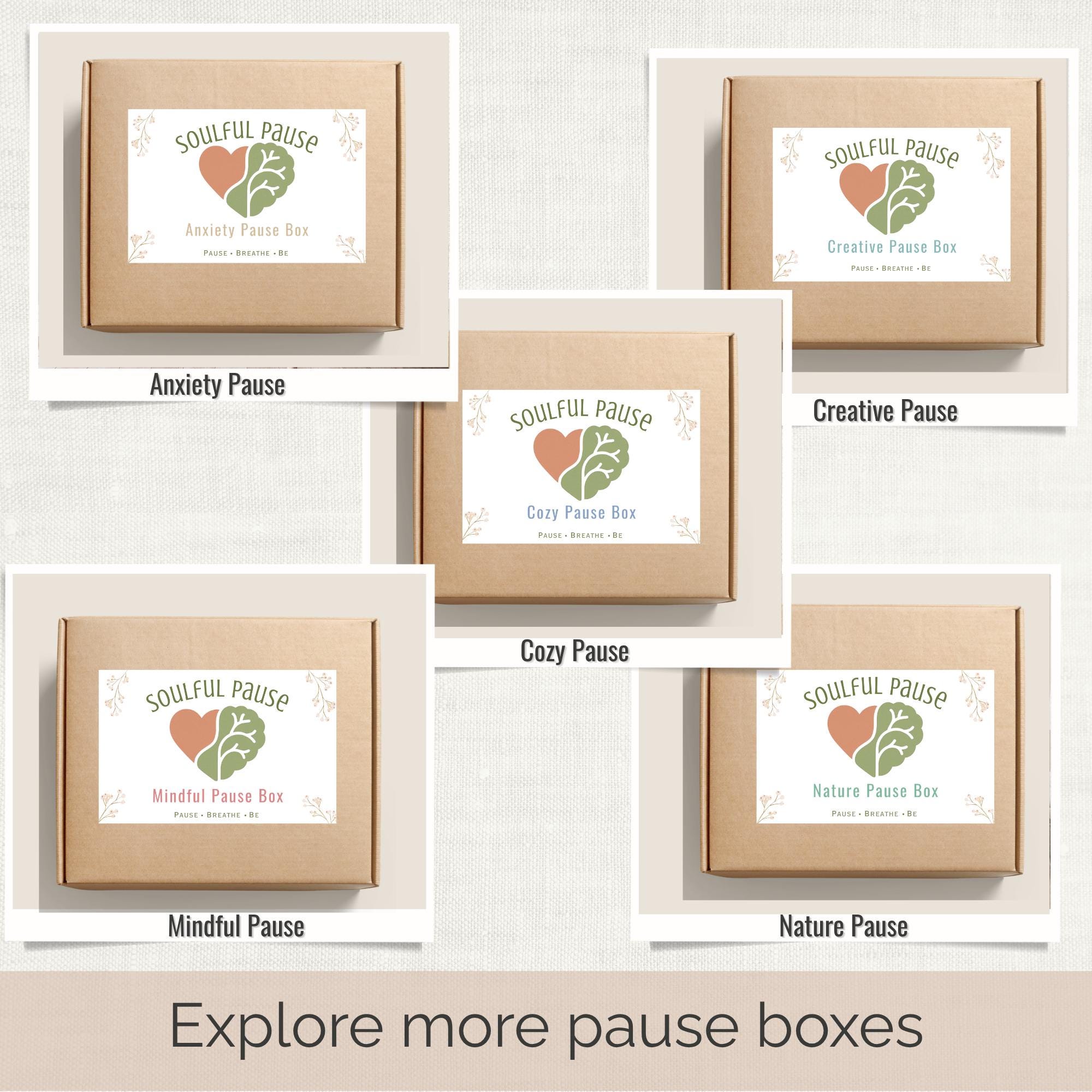 The Anxiety Pause Box is a gentle, thoughtfully curated self-care experience designed to help ease overwhelm, quiet racing thoughts, and bring you back to a place of calm.